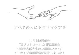 11/1(土)TSプロトコール & IFS講演会の杉山登志郎先生ご講演について、 新潟トラウマ治療協会からアーカイブ動画配信決定のお知らせを頂きました! 会場参加0円 当日オンライン500円 (申込〆切は10/30(木)23:59) アーカイブ動画は後日受付で1000円とのことです! https://npotraumatreatment.com/2025